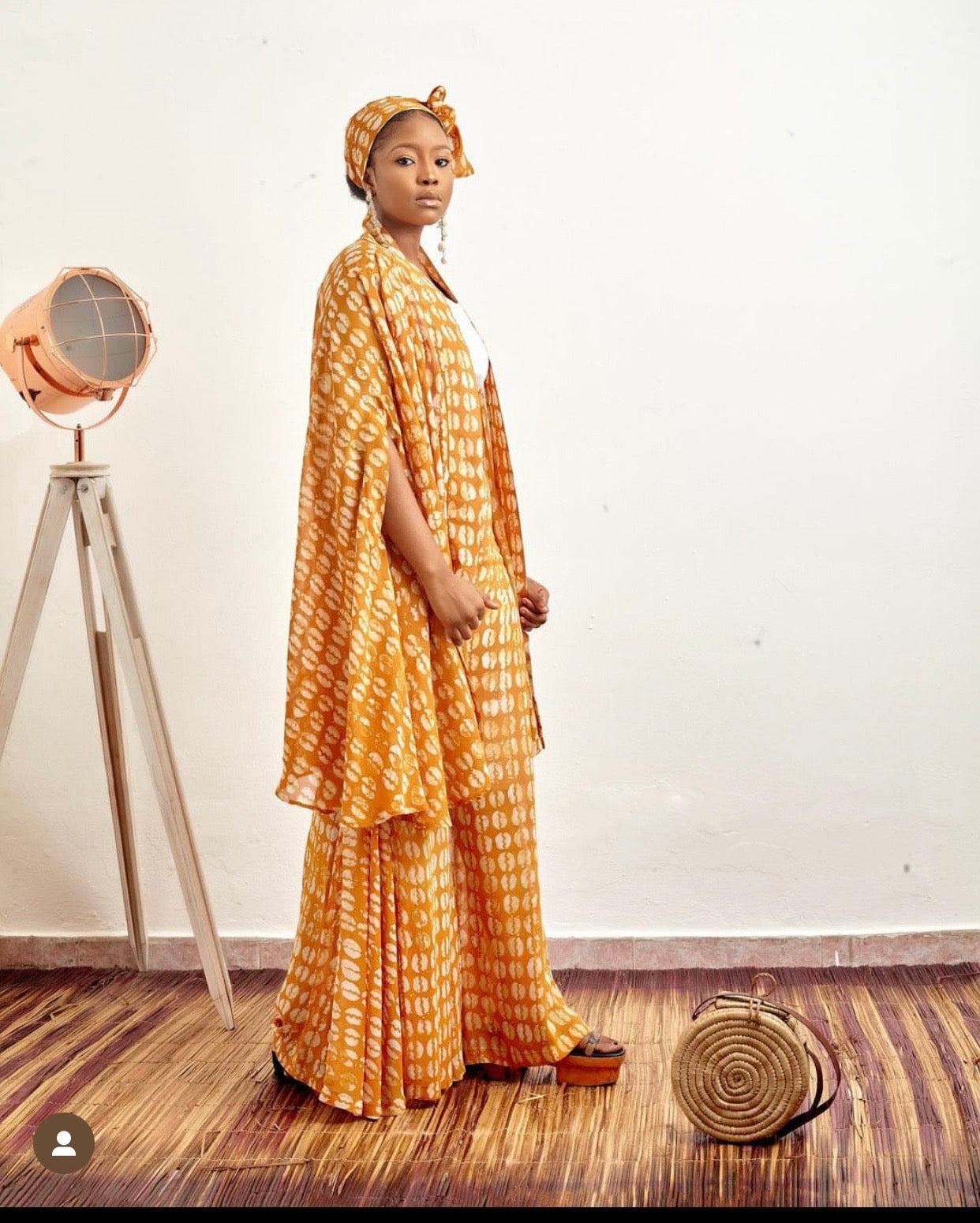 Expertly crafted from 100% mulberry silk, the Aise Cape combines the elegance of a kimono with the versatility of a cape. Hand dyed in our signature Agberu print, featuring golden yellow and white hues, this luxurious piece is perfect for adding a touch of sophistication to any outfit.