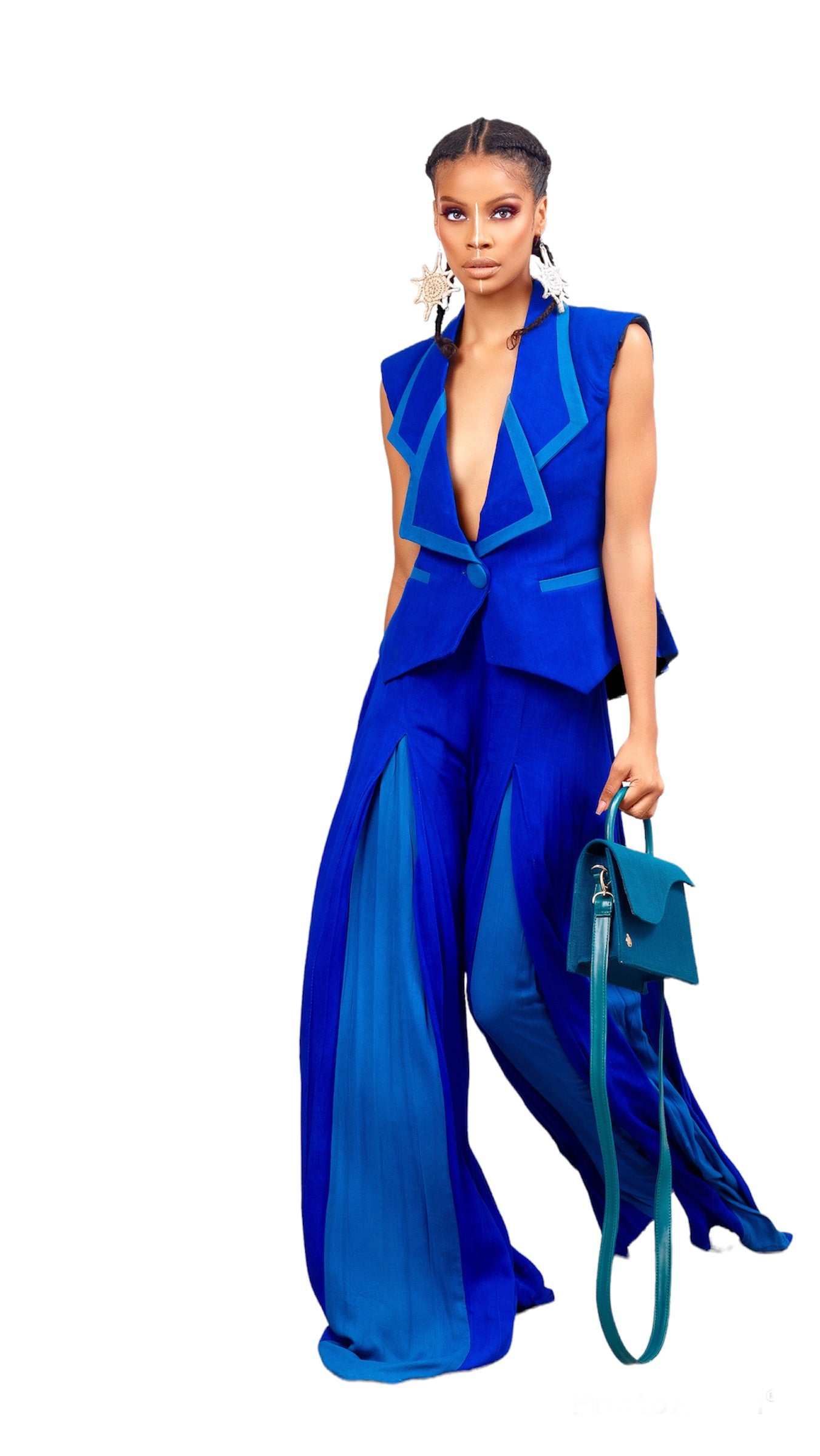 Upgrade your wardrobe with the Habeebah Vest. Made from luxurious viscose crepe, this royal blue and teal suit features an exaggerated collar, strong shoulders, and pleat detailing at the back. Elevate any outfit with this versatile and stylish piece.