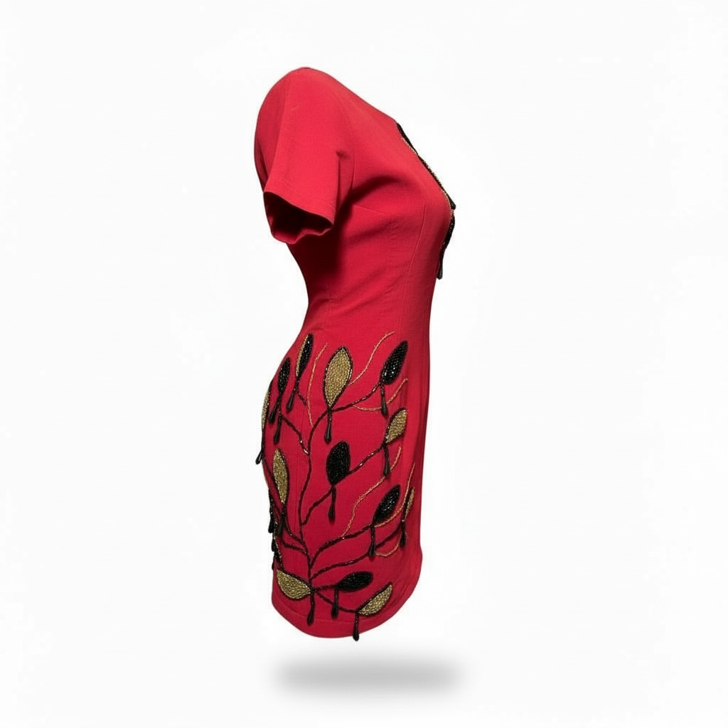 Indulge in timeless elegance with our Nneoma mini dress. Featuring a fiery red hue and intricate beaded vegetation details on the shoulders and hips with an in built waist corset, this dress is a true work of art.