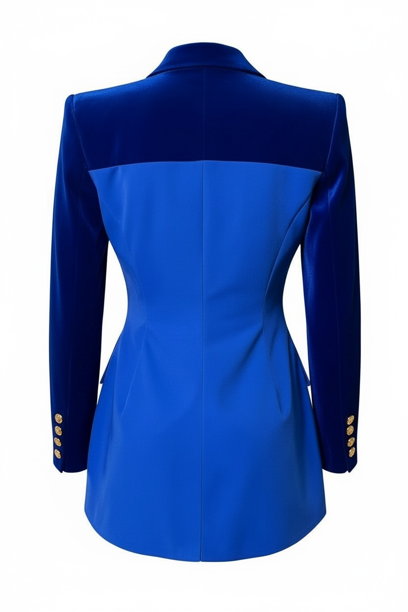 Expertly crafted from royal blue velvet and crepe, The Eze Blazer exudes sophistication. With gold button details and strong shoulders, this blazer is perfect for making a bold statement. Elevate your style and confidence with this luxurious piece.